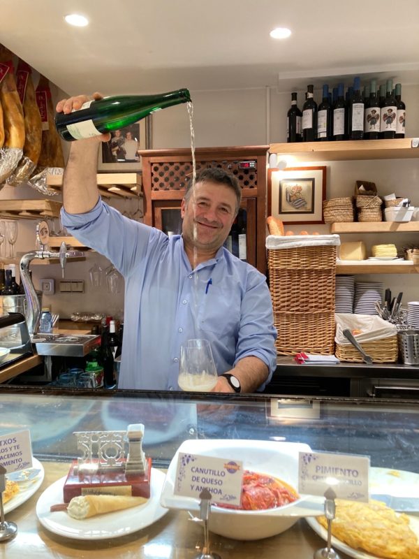 高い位置から注ぐのには理由があります。かつての「チャコリ」は、現在のものより酸が高く酸っぱかったので、上からグラスに液体をぶつけることによりワインに空気が含まれ、酸味が穏やかになり飲みやすくなるとされていました。また、勢いよく注ぐことで、気泡がより立ち、口当たりがよくなるともいわれています。今ではパフォーマンス的な要素が大きくなりましたが、特徴的な注ぎ方がカマレロの習慣になっていったのですね。